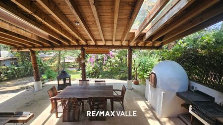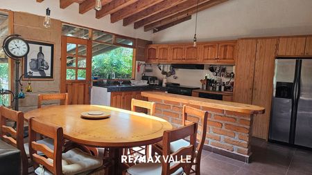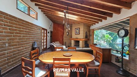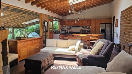 Linda casa de campo construida en un solo nivel, cuenta con 3 recámaras, 2 baños completos, sala con chimenea, comedor, cocina, alacena, área de lavado, terraza techada con asador, vista al bosque y al jardín, atrás de la casa tiene un bungalow que puede funcionar como área de visitas, estudio, sala de tv. o área de servicio con baño completo.